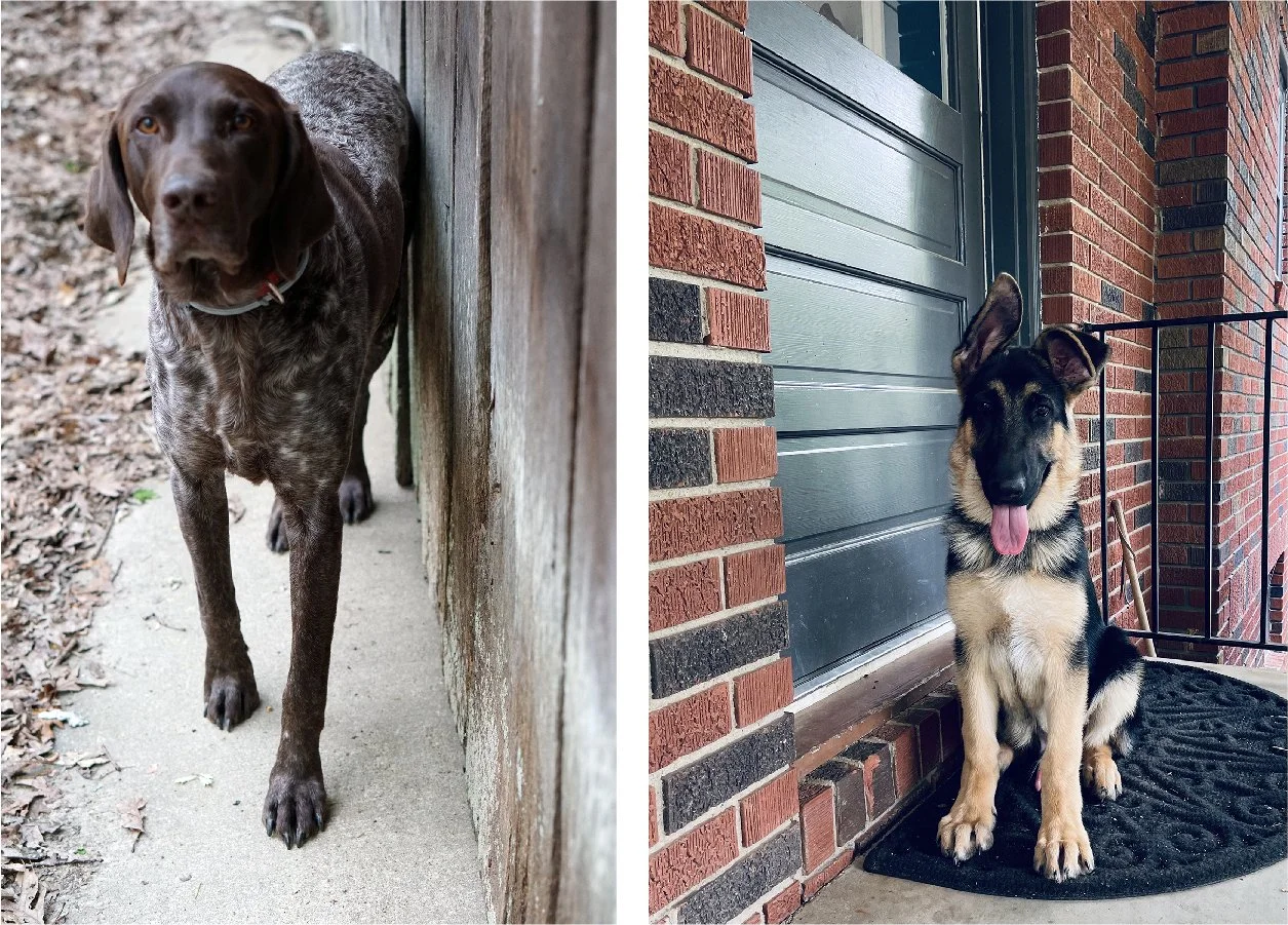 Zeiger, a German short-haired pointer outside his fave spot-the chicken barn; & Reagan, a German shepherd puppy.