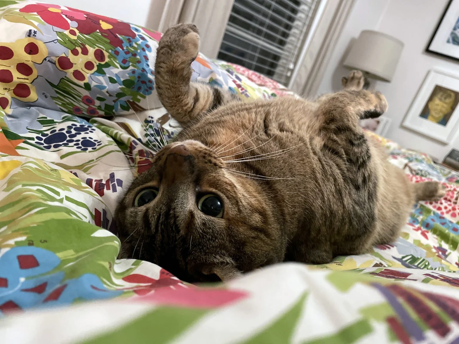 Sabrina, the author's rescue cat, loves lounging on the bed, her favorite spot in the house.